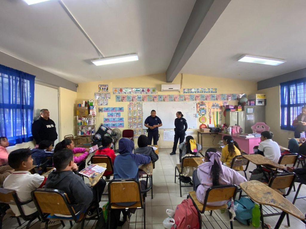 A través de la Dirección de Seguridad Pública, elementos del Agrupamiento Violeta y de la Policía Rural visitaron la Escuela Primaria “29 de Octubre”, en el ejido El Quemado, donde impartieron pláticas dirigidas a estudiantes sobre violencia escolar, respeto, sana convivencia y mecanismos de apoyo.