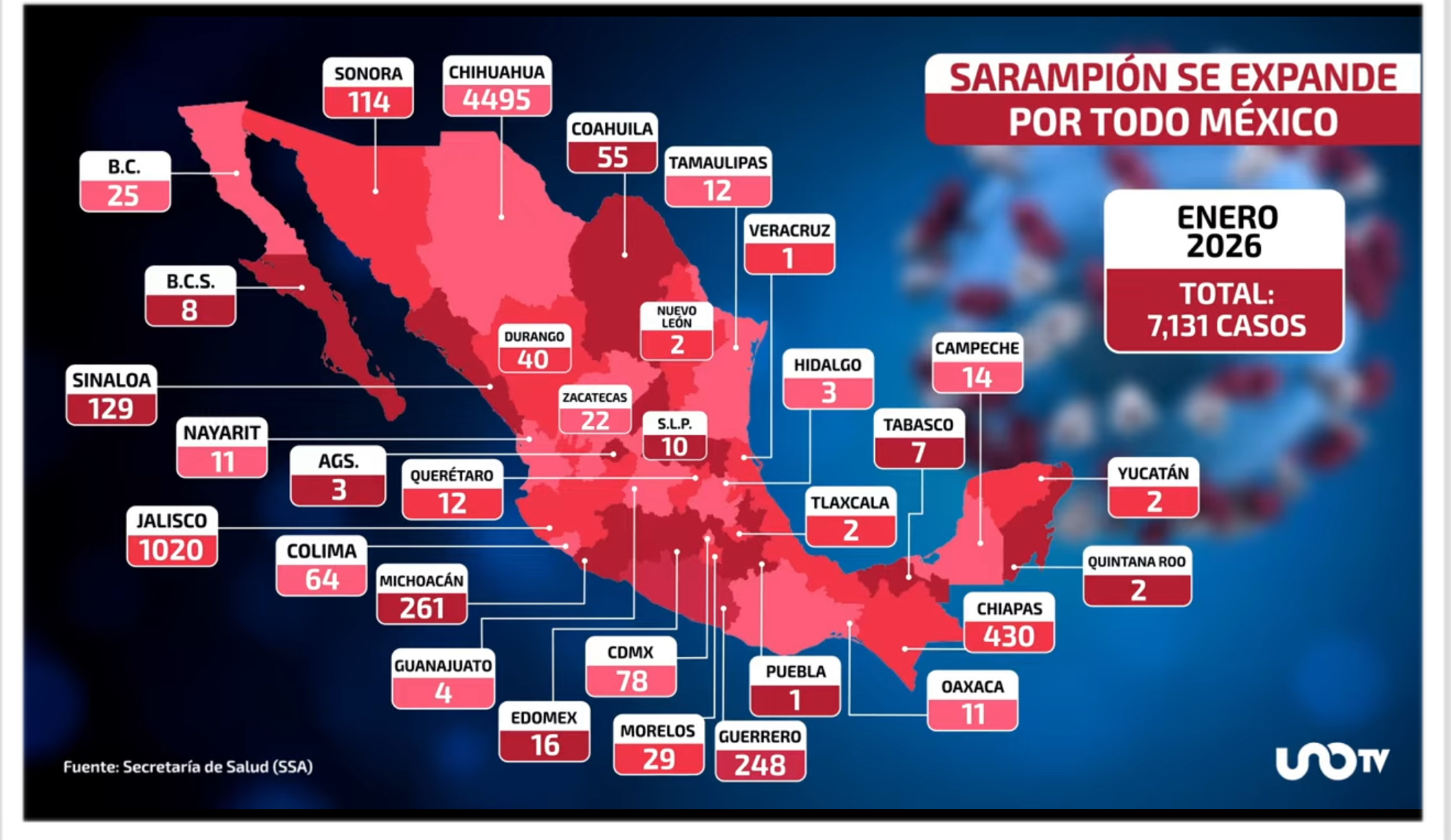 Los datos hoy, son preocupantes: 7 mil 168 casos confirmados y 24 defunciones, al corte oficial del 19 de enero de 2026, según el Informe Diario del Brote de Sarampión de la Secretaría de Salud.